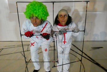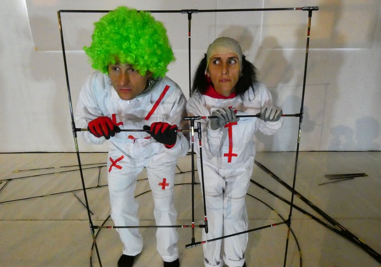 LA CASA INTEMPÉRIE is a performance for two acrobatic clowns who attempt to build a shelter using 2,000 tent poles.